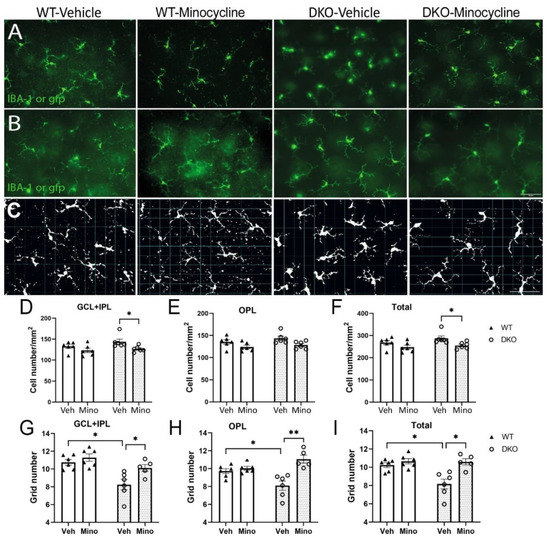 We further analyzed the microglial cell size based on the coverage of dendrites using a grid system previously reported [27] (Figure 5C) as a readout of microglial activation. No significant difference was observed in vehicle- and minocycline-treated WT mice in different retinal layers of microglia (Figure 5G–I). Microglia in both GCL + IPL and OPL from vehicle-treated DKO mice had significantly smaller grid coverage, which was restored in minocycline-treated mice (Figure 5G–I).