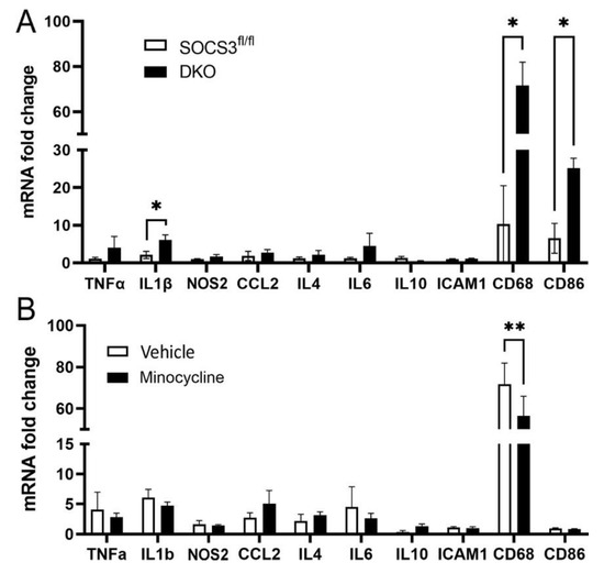 The effect of minocycline in retinal immune related gene expression. The mRNA was extracted from 9-month-old wild type (Socs3fl/fl) or DKO mouse retinas (A) or vehicle- and minocycline-treated DKO (9-month old) retinas (B). The expression of inflammatory genes including Tnfa, IL1b, Nos2, Ccl2, Il4, Il6, IL10, Icam1, Cd68, and Cd86 was evaluated by real-time RT-PCR. Mean ± SEM, n = 6. * p < 0.05, ** p < 0.01 by Student’s t-test.