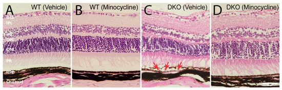 We previously showed that the aged DKO mice (10~12 months old) developed sub-retinal microglial accumulation and localised RPE damage [28]. In this study, histological investigations showed normal retinal structure in the vehicle- and minocycline- treated WT mice (Figure 8A,B). The vehicle treated DKO mice displayed discrete areas of RPE vacuoles and corresponding distorted retinal layers (arrows in Figure 8C). The RPE damage was not observed in minocycline treated DKO mice (Figure 8D).
