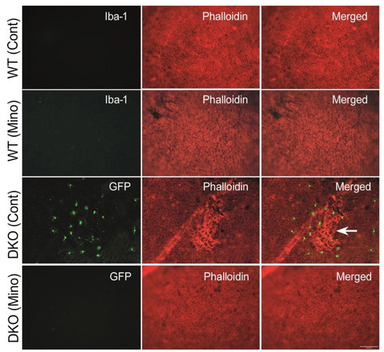 We further investigated RPE structure in flatmount examination following phalloidin (and Iba-1 in WT mice) staining. No RPE dysmorphia was observed in the vehicle and minocycline treated WT mice (Figure 9), and Iba-1+ cells were rarely detected. Vehicle-treated DKO mice displayed patches of RPE dysmorphia accompanied by infiltrating GFP+ microglial cells, which was not observed in minocycline-treated DKO mice (Figure 9).