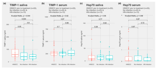 (a) TIMP-1 saliva concentration in subjects with HNSCC, control subjects without infection, and control subjects with head and neck infection; (b) TIMP-1 serum concentration in subjects with HNSCC, control subjects without infection, and control subjects with head and neck infection; (c) Hsp70 saliva concentration in subjects with HNSCC, control subjects without infection, and control subjects with head and neck infection; and (d) Hsp70 serum concentration in subjects with HNSCC, control subjects without infection, and control subjects with head and neck infection.