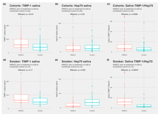 Comparing pretreatment HNSCC (n = 53) and combined control subjects (n = 40) for TIMP-1 and Hsp70 both in serum and saliva. (a) TIMP-1 saliva concentration in HNSCC and combined control subjects; (b) Hsp70 saliva concentration in HNSCC and combined control subjects; (c) TIMP-1/Hsp70 saliva ratio comparing HNSCC and combined control subjects; (d) saliva TIMP-1 in smokers with HNSCC and combined smoking control subjects; (e) saliva Hsp70 in smokers with HNSCC and combined smoking control subjects; and (f) TIMP-1/Hsp70 ratio in smokers with HNSCC and combined smoking control subjects.