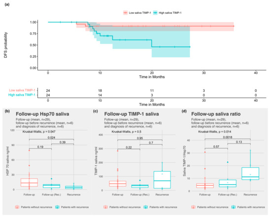 (a) Disease-free survival probability for high and low saliva TIMP-1 by the median cut-off of 62.8 ng; (b) comparison of saliva Hsp70 during follow-up (mean per subject) for HNSCC-patients without recurrence, before recurrence, and levels at the time of recurrence; (c) comparison of saliva TIMP-1 during follow-up (mean per subject) for HNSCC-patients without recurrence, before recurrence, and levels at the time of recurrence; and (d) comparison of saliva TIMP-1/Hsp70 ratio during follow-up (mean per subject) for HNSCC patients without recurrence, before recurrence, and levels at the time of recurrence).