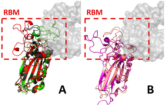 - Ford, C.T.; Jacob Machado, D.; Janies, D.A. Predictions of the SARS-CoV-2 Omicron Variant (B.1.1.529) Spike Protein Receptor-Binding Domain Structure and Neutralizing Antibody Interactions. Front. Virol. 2022, 2, 830202. [Google Scholar] [CrossRef]