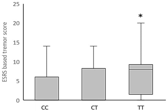 Distribution of ESRS-based tremor/hyperkinesia scores in haloperidol-treated schizophrenia patients with different HTR6 rs1805054 genotypes. Data are expressed as median (Q1; Q3). * p = 0.011 vs. CC genotype carriers, Dunn’s post-hoc test following Kruskal–Wallis analysis.