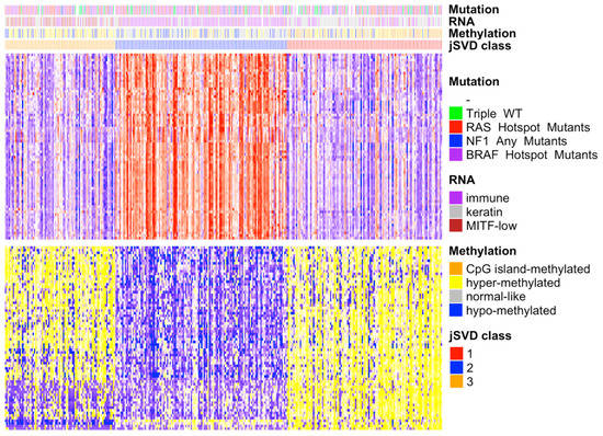 Heatmap of differentially expressed genes and methylation probes in the 3 jSVD classes. On the right is the legend of the four bars representing the TCGA SKCM somatic driver mutations, RNA and DNA methylation classes, and jSVD classes. The heatmap on top represents the RNA expression data; the gene expression is represented according to the mean values, with above mean values in red, below mean in blue, and at the mean in white; the intensity reflects the distance from the mean. The bottom heatmap shows the intensities of the DNA methylation probes; the colors range from yellow (hypermethylated, above mean) to blue (downmethylated, below mean). The bars above the heatmaps show information on the tumors obtained from the TCGA, including somatic mutation types (mutations of RAS, NF1, BRAF, or of none of these genes, triple wild-type), RNA clusters (immune, keratin, MITF-low), and methylation types (CpG island methylated, hypermethylated, normal-like, hypomethylated). Class 2 patients are enriched for immune RNA classes and normal-like methylation subtypes that were associated with better survival []. Cluster 1 is enriched in the CpG island methylated subtype, which was associated with the worst survival rate [], as confirmed here (see Figure 2). Class 3 is enriched for hypermethylated and hypomethylated classes that were associated with a worse prognosis compared to normal-like classes [], which are abundant in class 2.