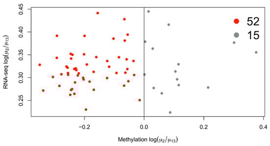 Another general limitation of DF development is the absence of a test set, where a gold standard for machine learning is used to tune the model parameters based on a set of samples (training set) and evaluate the performance based on a different set (test or validation set) []. This is a general rule that is followed to avoid overfitting, a situation in which the model captures all of the variation inside the data but is not able to make any relevant predictions based on the different datasets []. DF methods such as SNF and jSVD can be considered unsupervised methods; therefore, they do not require parameter training. However, a different dataset to evaluate the stability in terms of the predicted clusters and the extracted features could be beneficial. The quality of features selected by means of DF could in principle be analyzed with a single plot, in which the state of the features selected from the different domains is reported. In this work, we simply checked the mean gene methylation state of overexpressed features in the RNA-seq domain (Figure 2). This approach, which relies on the general association of methylation with gene repression, has already been used to integrate the results of single-domain analyses [,]. Potentially, this kind of integration method combined with data fusion could support the analysis of low quality data from one genomic domain by adding information from a more reliable one. It would, for example, be possible to consider only those differentially expressed genes that are also differentially methylated or associated with a CNA event [].