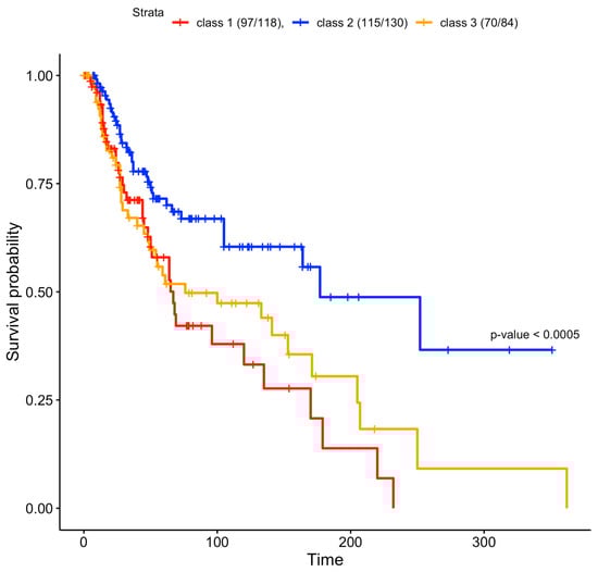 To verify whether the predicted clusters were associated with different survival curves, we plotted their relative Kaplan–Meier curves [,,]. The class 2 patients had a better survival rate compared to class 1 and 3 patients; this class is enriched in immune RNA classes and normal-like methylation subtypes (Figure 1), which were associated with better survival in the study by Akbani et al. []. Cluster 1 is enriched in the CpG island methylated subtype, which has been associated with the worst survival rate []. Cluster 1 had the lowest survival rate (Figure 4). Class 3 is enriched with hypermethylated and hypomethylated classes that were associated with worse prognosis compared to normal-like classes [], which are abundant in class 2 (Figure 2). The log-rank test of the survival curves showed that class 2 had a significantly better survival rate compared to classes 1 and 3. The difference between the latter two was not significant (Table S1B).