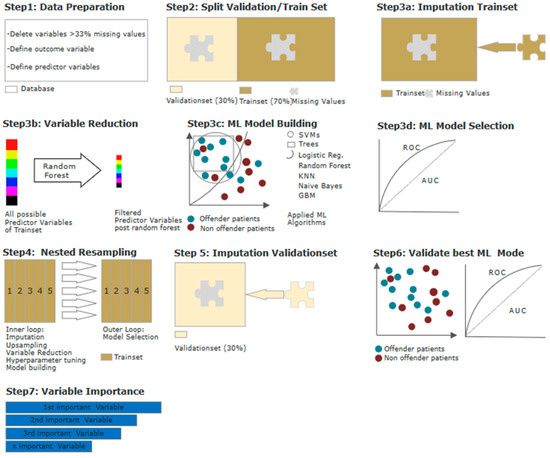 Machine learning model building and validation, step by step: Step 1—Data preparation: Multiple categorical variables were converted to binary code. Continuous and ordinal variables were not manipulated. Outcome variable offender/non-offender patient and predictor variables were defined. Step 2—Datasplitting: Split data into 70% training dataset and 30% validation dataset. Step 3a–d—Model building and selection: (a) imputation by mean; (b) variable reduction via random forest; (c) model building via ML algorithms—logistic regression, trees, random forest, gradient boosting, KNN (k-nearest neighbor), support vector machines (SVM), and naïve Bayes; and (d) testing (selection) of best ML algorithm via ROC parameters. Step 4—Model building and testing on training data: nested resampling with imputation, variable reduction, and model building in inner loop, and model testing on outer loop. Step 5—Imputation with stored weights from Step 3a on validation set. Step 6—Model building and testing on validation data: best model identified in Step 3c applied on imputed validation dataset and evaluated via ROC parameters. Step 7—Test for multicollinearity and ranking of variables by indicative power.