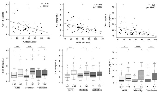 GDF-15, CD-25 and RAGE resulted in the unique plasma biomarkers significantly associated with eGFR, a need of NIV and mortality out of the 20 tested molecules (Table S1). Plasma levels of these biomarkers were negatively associated with basal eGFR (Figure 1). Plasma concentrations of GDF-15, CD-25 and RAGE were significantly higher in deceased patients and in those receiving NIV (Figure 1).