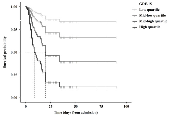 Patients with an age > 75 years (p = 0.005), fever (p = 0.005), dyspnea (p = 0.003) and P/F < 300 (p = 0.034) were significantly associated with mortality at univariate analysis. Survival curves stratified according to GDF-15 quartiles are presented in Figure 2. In a multivariate Cox regression model, each increase in GDF-15 quartiles was associated with a 128% increased mortality risk [HR 2.28 (1.53–3.39, 95% CI), p < 0.001] independent from basal eGFR and the aforementioned predictors (Table 2). CD-25 and RAGE were excluded from the model by a stepwise selection procedure. Stronger association between GDF-15 and mortality was descriptively observed among patients with eGFR < 45 mL/min/1.73 m2 [HR 2.54 (1.34–4.79), 95% CI] compared with a higher eGFR strata [HR 1.99 (1.17–3.39, 95% CI)]. Results were unchanged in the sensitivity analysis after the exclusion of 8 outlying observations for GDF-15 (Table S2) and dialysis patients (Table S3).