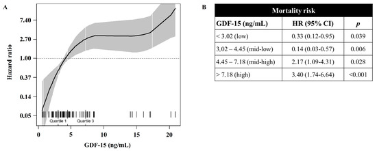 Univariate association between GDF-15 and mortality risk. (A) Cubic spline analysis revealing nonlinear association between GDF-15 and mortality risk: the solid line represents the HR according to GDF-15 level, the gray area represents the 95% CI, ticks in the lower part of the figure represent each observation. (B) Univariate association between GDF-15 quartiles and mortality risk; each quartile was compared with 3 other quartiles as a whole comparator.