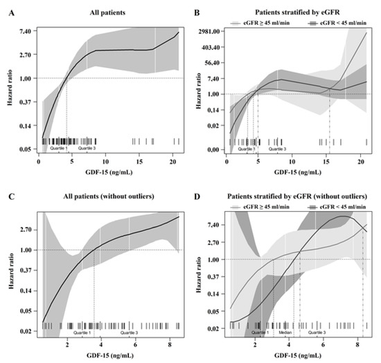 Univariate polynomial splines revealed a nonlinear association between GDF-15 and survival (Figure 3A). At univariate analysis, first and second GDF-15 quartiles were singularly associated with a lower mortality risk [HR 0.33 (0.12–0.95, 95% CI) and HR 0.14 (0.03–0.57, 95% CI), respectively] (Figure 3B). On the other hand, third and fourth GDF-15 quartiles were singularly associated with an increased mortality risk [HR 2.13 (1.09–4.31, 95% CI) and 3.4 (1.74–6.64, 95% CI), respectively]. Protective and harmful associations between GDF-15 and mortality were observed for circulating levels below and beyond the median (4.45 ng/mL), respectively, after adjustment for age, fever, dyspnea, P/F and eGFR (Figure 4A). Both the protective and the harmful associations between GDF-15 and mortality were descriptively more pronounced among patients with eGFR < 45 mL/min/1.73 m2 (Figure 4B). The trend was confirmed after the exclusion of GDF-15 outliers (Figure 4C,D). In the subset of patients with eGFR < 45 mL/min/1.73 m2 and known CKD reported in their medical history (18 patients, 10 of whom died), we found a linear and positive association between GDF-15 and mortality risk in the univariate Cox regression [HR 1.13 (1.01–1.27, 95% CI) for every 1 ng/mL increase in GDF-15 level], although the small sample size and low number of events did not allow us to investigate this association in multivariate models.