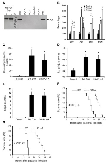 Mice sepsis models induced by peritoneal injection of D39 and PLN-A bacteria. (A) Western blot shows that D39 has detectable PLY, but PLN-A or E.Coli have no detectable PLY. (B) Five mice per group were injected with saline (control), D39 (PLY(+)) (4 × 107 CFU/mouse, i.p.), or PLN-A (PLY(−) (4 × 107 CFU/mouse, i.p.). Blood and organs were collected at 24 h after injection. The means ± SD of relative increase in LDH, ALT, cTnI, and BUN are presented. An ANOVA test * p < 0.05 was compared to the control. # p < 0.05 was compared to the PLY(+) bacteria-induced mouse model. The means ± SD of circulating histones (C), lung injury scores (D), and sepsis scores (E) showed no statistical difference between PLY (+) and PLY (−) models, but * p < 0.05 was compared to control groups. (F and G) Survival curves of mice injected with D39 or PLN-A (4 × 107 CFU/mouse i.p. (F); or 2 × 108 CFU/mouse i.v. via the tail vein (G)). 8–10 mice per group, log rank test, p < 0.05.