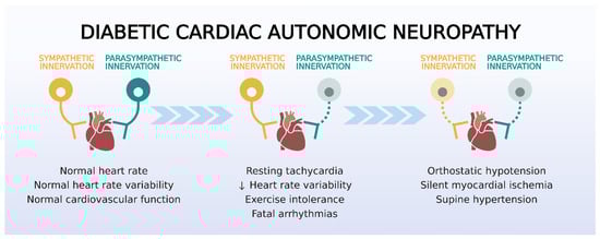 Evolution of symptoms of cardiac autonomic neuropathy (CAN) in diabetes. Patients display reduced variability in heart rate and resting tachycardia in the early phase of parasympathetic dysfunction, which underlie the reduced exercise tolerance and the increased arrhythmogenesis. Later stages of CAN involve sympathetic denervation and cause hemodynamic dysregulation and silent myocardial ischemia. Source: Own authorship.