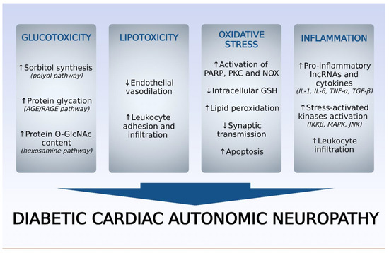 Additionally, diabetic peripheral neuropathy is caused by the effects of chronic exposure to hyperglycemia, which promote glycotoxic stress, inducing increased oxidative stress with increased ROS; dysfunction of the antioxidant system; activation of the JNK, AP-1, PKC, NFκB, and MAPK; the additional formation of polyols and glycosamines; AGE favoring the transcription of genes encoding TGF-β, IL-1, IL-6, and TNF-α; and induced nitric oxide (iNOS). ROS induces depression of autonomic ganglion synaptic transmission, contributing to increased risk of fatal cardiac arrhythmias as well as to sudden death after myocardial infarction [29]. Mitochondrial dysfunction is associated to all these processes that lead to apoptosis and autophagy, bioenergetic dysregulation, neurovascular dysfunction, and inflammation and demyelination of nerves [30].