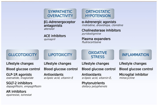 Antioxidants, which are scavengers of free radicals, can reduce the formation of ROS and consequently decrease orthostatic hypotension. Antioxidant therapy (alpha-lipoic acid, vitamin E) or C peptide is responsible for better prognosis for CAN. Alpha-lipoic acid inhibits hexosamine and AGE pathways, while vitamins are immune stimulators and inhibitors of ROS-metabolite-induced DNA damage [19,47,48]. Attenuation of CAN progression through vitamin D supplementation shows a U-shaped dose–response relationship, and studies suggest that clinical benefit is achieved only for diabetic patients with insufficient serum levels (<50 nmol/L) [54]. Administration of minocycline—an inhibitor of microglial activation—was also investigated, and its use for 6 weeks demonstrated improvement of CAN in diabetic patients with good tolerability [48].