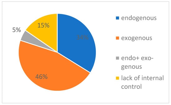 The strategy of avoiding false positives involves performing additional positive and negative controls. The positive control, i.e., carrying out a PCR reaction with a sample of the isolated virus RNA, necessarily on each plate/strip, parallel to the samples taken from patients, allows verifying that the amplification and detection are correct. A negative control, generally called a “no template control” (NTC), is a reaction where buffer or water is added instead of the sample to eliminate contamination of the reagents and the laboratory work zone in general. Internal controls (ICs) can be divided into exogenous and endogenous controls. The first represents a housekeeping gene, i.e., a gene that is constitutively expressed in all human cells. Typically, it is gene of β-actin (ACTB), glyceraldehyde-3-phosphate dehydrogenase (GADPH), RNAse P, or β-globin. Detection of ICs verifies that the sample contains human mRNA and that PCR takes place properly. Internal exogenous controls are generally synthetic nucleic acids added to each sample before the extraction process, which check extraction, reverse transcription, and PCR []. Providing an internal control is not obligatory, but generally guaranteed by manufacturers of diagnostic kits. This significantly increases the reliability of the results. Table S1 (see Supplementary Materials) presents information on what types of controls are included in the tests. Figure 1 graphically illustrates what proportion of all tests includes an internal control (only slightly more than a half). Of the 65 kits analyzed, only three had both an exogenous and an endogenous control. The most common gene analyzed as part of the endogenous control was the gene for RNAse P, with as many as 13 out of 22 sets containing primers for this sequence. The remaining kits analyzed beta-actin mRNA (3/22), analyzed other sequences, or did not specify what sequence. It has to be underlined that almost all kits that did not provide ICs at all were reflex tests, i.e., secondary tests conducted after initial positive results.