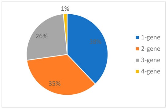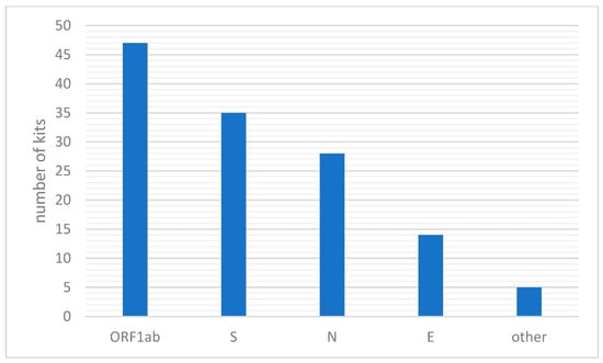 To minimize the risk of false positives related to the presence of non-SARS-CoV-2 virus, WHO recommends the detection of at least two different targets on the COVID-19 virus genome. Despite the large proportion (38% of commercially available tests) being based on analyzing only one gene, most of them are reflex tests, detecting specific variants in positive samples. Only a few of them were developed in the beginning of the pandemic and are still available, but they are generally not used in Europe. On the other hand, to increase the reliability of the test, some companies have developed tests that analyze up to three or four genes (see Figure 2). Table S1 shows which genes are detected by the analyzed kits. It turns out that the most frequently chosen target is the ORF1ab gene, with several tests also analyzing the S protein gene and the nucleocapsid gene (Figure 3).