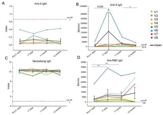 Evaluation of the SARS-CoV-2-specific humoral response in eight people living with HIV (PLWH) up to 2 months after the fourth vaccine dose. Anti-S IgM (cut off = 1) (A), anti-S IgG (cut off = 87.8) (B), neutralizing IgG (cut off = 1) (C), and anti-RBD IgG (cut off = 130) (D) serum levels were evaluated in PLWH before, one week, one month and two months after the fourth vaccine dose. Each color corresponds to a different subject. Black dots indicate mean values. * p ≤ 0.05, ** p ≤ 0.005. Error bars indicate SE values.