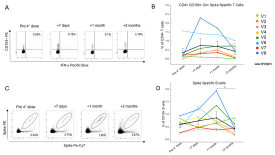 Evaluation of the SARS-CoV-2-specific circulating CD4+ T and B cells in eight people living with HIV (PLWH), up to 2 months after the fourth vaccine dose. (A) Representative flow cytometric plots of the spike-specific CD154+CD4+IFN-γ+ T cells in one selected individual living with HIV. (B) Kinetic analysis of the frequencies of the CD154+CD4+ T cells producing at least one cytokine among IL-2, IFN-γ, and TNF-α in eight PLWH before, one week, one month, and two months after the fourth vaccine dose. Each color corresponds to a different subject. The T cell evaluation of subject V4 lacks the +7 days timepoint. Black dots indicate mean values. (C) Representative flow cytometric plots of the spike-specific B cells in one selected individual living with HIV. (D) Kinetic analysis of the frequencies of the spike-specific B cells in eight PLWH before, one week, one month, and two months after the fourth vaccine dose. Each color corresponds to a different subject. Black dots indicate mean values * p ≤ 0.05. Error bars indicate SE values.