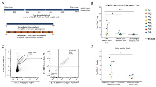 Assessment of the CD4+ T and B cells responses specific to the Wuhan SARS-CoV-2 spike and the B 1.1.529 SARS-CoV-2 VOC spike, 2 months after the administration of the fourth vaccine dose in eight vaccinated PLWH vaccinated. (A) Visualization of the SARS-CoV-2 spike protein (1273 aa) covered by the S1, S+ and S peptide pools, the wild type sequence and the mutated sequence (aa 19–981) in the Omicron B1.1. 529 (BA.1). All peptide pools contain 15-mer peptides, 11 aa overlapping. (B) The frequencies of the CD154+ cells producing at least 1 cytokine among IL-2, IFN-γ and TNF-α, stimulated with the spike peptide pool, wild type (Wuhan) or the B. 1.1.529 (Omicron) peptide pool covering the mutated sequence of the spike. (C) Representative plots of the identification of the Wuhan spike-specific, labelled with APC-PB, and the Omicron spike-specific B cells, labelled with PE-PeVio770 within the Wuhan spike-specific pool. (D) Frequencies of the spike specific memory B cells binding both the Wuhan spike and Omicron spike and the B cells binding exclusively to the Wuhan spike. Each color corresponds to a different subject. Black lines indicate mean values.* p ≤ 0.05, ** p ≤ 0.005. Error bars indicate SE values.