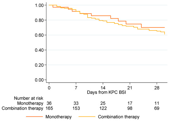 The primary objective was to evaluate the impact of appropriate empirical therapy, either monotherapy or combination therapy, on mortality and to evaluate survival on day 7, day 14 and day 28 from BSI onset in patients with nosocomial KPC-Kp BSI.