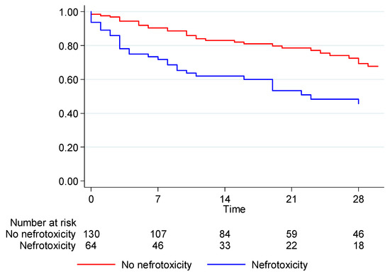 In the subgroup analysis, 194 patients were treated with a regimen including colistin or aminoglycoside. Of them, 64 patients (32.99%) developed nephrotoxicity, and 39 patients (60.94%) died during hospitalization. According to the the Kaplan–Meier estimate, the 7-day survival was 90.39% for patients who did not develop nephrotoxicity and 71.84% for patients who developed nephrotoxicity. At the 14-day endpoint, survival was 83.11% for patients who did not develop nephrotoxicity and 62.03% for those who developed nephrotoxicity. At 28 days, survival was 78.53% for those who did not developed nephrotoxicity and 53.30% for those who develop nephrotoxicity. At the 28-day endpoint, survival was 69.34% for patients who did not develop nephrotoxicity and 45.65% for those who developed nephrotoxicity. The difference in survival between patients who developed nephrotoxicity and those who did not develop nephrotoxicity was statistically significant (p = 0.0021) (Figure 3, Table 6).