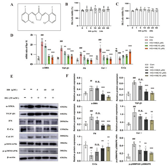 H8 mitigated ECM over-accumulation in HG-stimulated HK-2 cells. (A) The H8 chemical structure: (2E, 5E)-2,5-double [(2-fluoro-6-three fluoromethyl) benzyl methylene]-cyclopentone (C21H12F8O; relative molecular mass: 432.31). The effects of different concentrations of H8 on the proliferation of HK-2 cells at the various time points of (B) 24 h and (C) 48 h. HK-2 cells were co-treated with H8 (5, 10, and 15 μM) and HG (35 mM) for 48 h. (D) The mRNA expression levels were examined by qPCR, and the values were normalized to rps16 (α-SMA, TGF-β1, FN, Col IV, and E-Ca). (E) Western blot band. (F) The protein relative expression levels (α-SMA, TGF-β1, FN, Col IV, E-Ca, and the ratio of P-p38MAPK/p38MAPK). (G) The IF was performed using FN antibody, and DAPI was used for staining cell nuclei (scale bar = 50 μm). Data are shown as mean ± S.D. (n = 5). ## p < 0.01, and ### p < 0.001 compared to Con group; * p < 0.05, ** p < 0.01, and *** p < 0.001 compared to HG group; n.s. represents no significant difference in statistics compared to HG group.