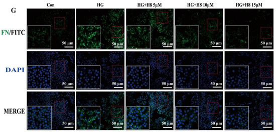 HG decreases ECM degradation and increases the epithelial-to-mesenchymal transition (EMT) [27,28]. To identify whether H8 reduced EMT, the optimal concentrations of H8 (5, 10, and 15 μM) were administrated to HG-stimulated HK-2 cells. Firstly, the results of the MTT assay showed that H8 was safe and non-toxic (Figure 1B,C). The qPCR results indicated that H8 reduced the mRNA expressions of α-SMA, FN, Col IV, and TGF-β1 in HG-stimulated HK-2 cells. However, H8 boosted the expression of E-Ca mRNA (Figure 1D). The Western blot analysis demonstrated that the different concentrations of H8 completely inhibited the over-deposition of ECM proteins in the HG-stimulated HK-2 cells (Figure 1E,F). IF further revealed that HG increased the levels of FN in HK-2 cells, and the elevated levels of FN were reduced by H8 (Figure 1G). Meanwhile, the p38MAPK signaling pathway was activated in the HG-stimulated HK-2 cells, but H8 restored these changes.
