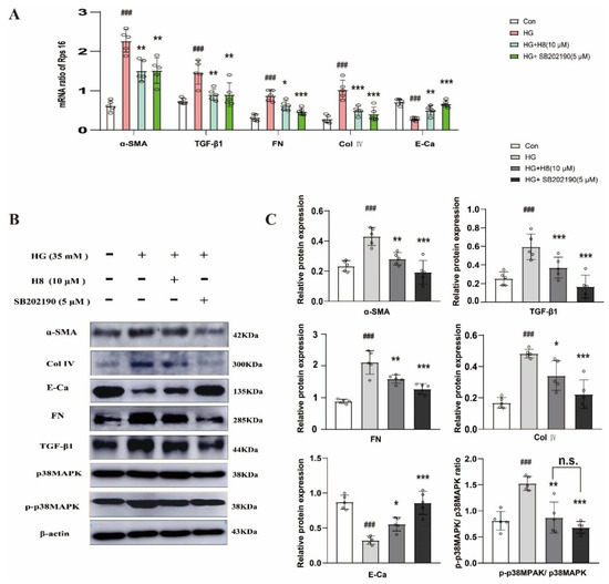 H8 reduced the excessive expressions of ECM in HG-stimulated HK-2 cells, which was related to p38MAPK. (A) The mRNA expression levels were examined by qPCR, and the values were normalized to rps16 (α-SMA, TGF-β1, FN, Col IV, and E-Ca). (B) Western blot band. (C) The protein relative expression levels (α-SMA, TGF-β1, FN, Col IV, E-Ca, and the ratio of P-p38MAPK/p38MAPK). Data are shown as mean ± S.D. (n = 5). ### p < 0.001 compared to Con group; * p < 0.05, ** p < 0.01, and *** p < 0.001 compared to HG group; n.s. represents no significant difference in statistics.