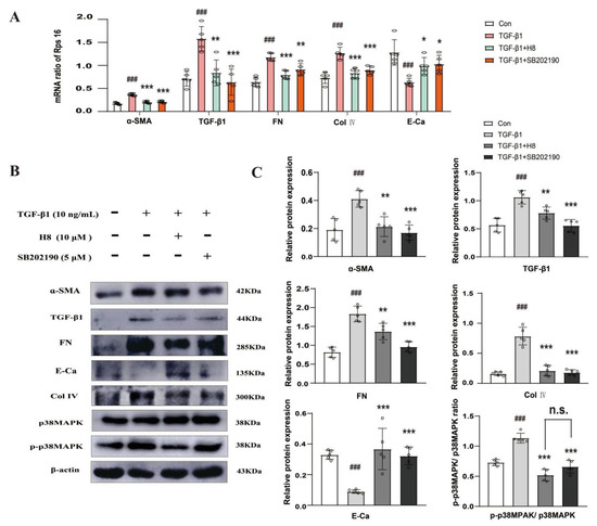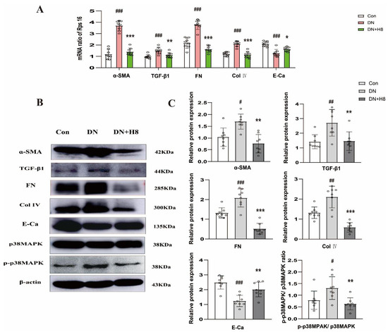 The qPCR results uncovered that the mRNA expressions of FN, α-SMA, TGF-β1, and Col IV in the DN group were notably increased in comparison to the Con group, and the H8 treatment remarkably downregulated the above levels. However, the E-Ca change was contrary to other mRNA expressions (Figure 8A). Compared to the Con group, the expressions of the ECM proteins in the DN group significantly changed, and they were reversed by the H8 treatment (Figure 8B,C). Furthermore, P-p38MPAK was significantly blocked by H8 in the DN rats.