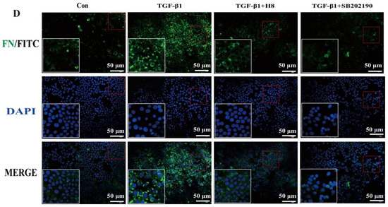 To further verify the potential molecular mechanism with which H8 acts on the over-accumulation of ECM, the ratio of P-p38MAPK/p38MAPK was examined in TGF-β1-induced HK-2 cells that were administered with H8 or SB202190. H8 and SB202190 effectively improved the variation of the mRNAs compared to the TGF-β1 group (Figure 3A). The results of the Western blot assay showed that H8 and SB202190 had similar pharmacological effects, which effectively reduced the levels of the ECM proteins, increased the expression of E-Ca, and suppressed the activation of the p38MAPK signaling pathway in the TGF-β1-induced HK-2 cells (Figure 3B,C). The IF analysis demonstrated that TGF-β1 upregulated the protein level of FN. However, H8 and SB202190 treatment alleviated the over-accumulation of FN at the same time (Figure 3D).