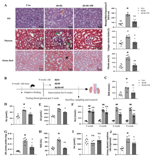 H8 improved the glomerular and tubular pathological changes and renal function in db/db mice. (A) HE staining, Masson staining, and Sirius Red staining of kidney sections in mice (original magnification 400×; scale bar = 50 µm). Orange arrow represents the glomerular mesangial expansion; green arrows represent accumulation of fibrosis in renal tubule; and black arrow represents formations of collagen in renal tubule. (B) The experimental design for the DN treatment in mice. (C) BUN (mmol/L). (D) Scr (µmol/L). (E) UA (µmol/L). (F) GLU (mmol/L). (G) 24 h urinary protein (mg). (H) NAG (U/L). (I) Ucr (µmol/L). (J) Urinary albumin/creatinine ratio (mg/mmol). Data are shown as mean ± S.D. (db/m n = 8, db/db n = 6, and db/db + H8 n = 8). # p < 0.05, ## p < 0.01, and ### p < 0.001 compared to Con group; * p < 0.05, ** p < 0.01 compared to db/db group; n.s. represents no significant difference in statistics.