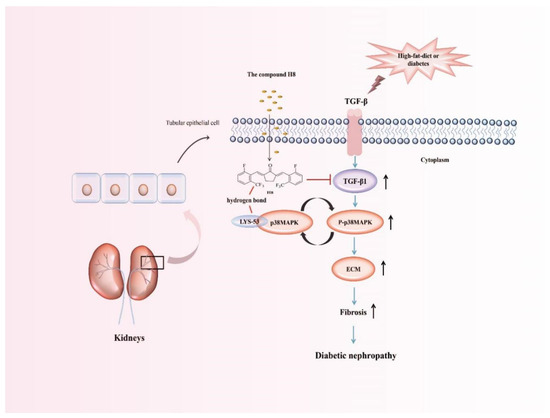 The TGF-β cytokine family is ubiquitous in most eukaryotes and has multifarious functions that are essential for survival. It exists in all tissues, but is particularly abundant in the kidneys, bones, lungs, and placenta, exerting a key role in growth and development, the inflammatory reaction, wound healing, tissue repair, and host immunity [5]. In general, releasing and activating TGF-β1 stimulates the production of various ECM proteins, accompanied by the inhibition of their degradation. Moreover, excessive TGF-β1 leads to tissue fibrosis and impairs normal organ function in many diseases [4,49]. For the occurrence and development of renal fibrosis, TGF-β1 plays a mediating role, which manifests in three aspects: (i) TGF-β1 directly induces ECM production (such as FN and ɑ-SMA) through Smad3-dependent or non-dependent mechanisms, including MAPKs [50,51]; (ii) TGF-β1 regulates matrix metalloproteinases (MMPs) to increase or decrease ECM [52]; and (iii) TGF-β1 regulates the transition of pericytes cells into myofibroblasts [53]. Some evidence shows that the upregulation of TGF-β1 in the glomerulus or tubulointerstitium or TGF-β1 exogenous additions causes renal fibrosis. However, renal fibrosis is improved by antagonizing TGF-β1 [54,55,56]. Moreover, renal epithelial cells differentiate into mesenchymal phenotypes due to TGF-β1. The main characteristics are cadherin changes, namely E-Ca (epithelium) to N-cadherin (mesenchymal) or a massive loss of E-Ca. However, the expressions of α-SMA, FN, Col I, and Col IV are increased [57]. In the present study, we also found that Col IV, α-SMA, and FN proteins and genes were significantly increased, accompanied by the activation of the p38MAPK signaling pathway, in the TGF-β1-induced HK-2 cells compared to the normal group. Compared to the TGF-β1 group, the H8 and SB202190 treatment groups showed significantly reduced expression levels of Col IV, α-SMA, and FN, as well as the P-p38MAPK/p38MAPK ratio, suggesting that H8 inhibited TGF-β1 and the downstream-related p38MAPK signaling pathways to alleviate diabetic renal fibrosis. In addition, compared to the Con group, the cell morphology of HK-2 exhibited significant changes in the HG and TGF-β1 groups, and the TGF-β1 group showed more obvious morphological changes. However, after the H8 treatment, the aforementioned morphological changes in the HK-2 cells were markedly improved (shown in supplementary Figure S2). Two sets of animal experiments, involving db/db mice and DN rats, and molecular docking data further confirmed that H8 inhibited the expression of TGF-β1, along with the downstream signal activation of the p38MAPK, thereby reducing the over-deposition of ECM, slowing EMT and relieving DN (Figure 9).