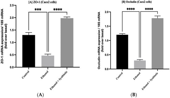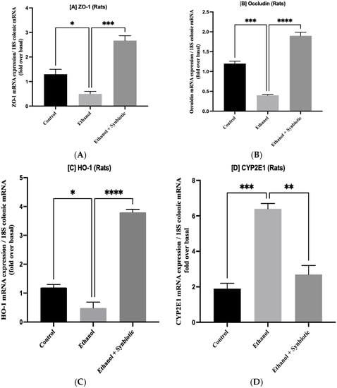 In the current work, both in vitro and in vivo ALD models demonstrated that synbiotics attenuate alcohol-induced TJ disruption. CYP2E1 may contribute to intestinal ethanol effects. It has been proven that CYP2E1 metabolites may be the principal source of ethanol-induced breakdown of the intestinal barrier as well as liver injury. CYP2E1 metabolism generates oxidative stress products such as MDA, which may generate reactive oxygen and nitrogen species that potentially damage the gut [14,50,54]. Alcohol-treated Caco-2 cells and animal studies exhibit increased CYP2E1 gene expression [13].