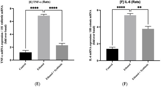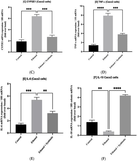 The effects of AGE and synbiotic on Caco-2 cells treated with ethanol. Tight junctions (A) ZO-1 and (B) occludin mRNA expression, as well as presentation of markers of inflammation (C) TNF-a, (D) CYP2E1, (E) IL-6, and anti-inflammatory indicator (F) IL-10, are all reported. The statistical analysis was calculated as mentioned in Section 2.11. Mean −/+ SD was determined for N = 6 replicates. For statistical analysis, GraphPad Prism 7 and one-way ANOVA in conjunction with the Tukey post hoc test were calculated. When associated with the ethanol group, significance (p-value) is defined as ** p < 0.01, *** p < 0.001, **** p < 0.0001.