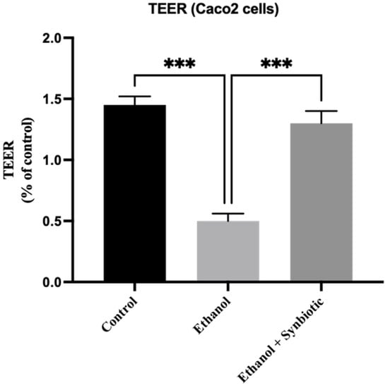TEER assessment of Caco-2 integrity: TEER investigation of the impact of probiotics and AGE individually or as synbiotic on the functionality of the intestinal barrier produced by ethanol in monolayers of Caco-2 cells. The statistical analysis was calculated as mentioned in Section 2.10. Mean −/+ SD was determined for N = 6 replicates. For statistical analysis, GraphPad Prism 7 and one-way ANOVA in conjunction with the Tukey post hoc test were calculated. When associated with the ethanol group, significance (p-value) is defined as *** p < 0.001.