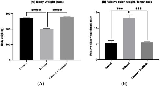 The alcohol group had lower BW and a more significant colon weight/length ratio than the control animals. Figure 4 demonstrates that synbiotic treatment enhanced overall weight and reduced the intestinal weight and length proportion compared to an ethanol group.