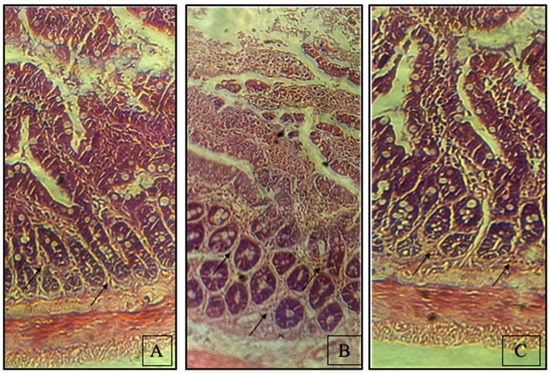 The influence of the synbiotic on the reduction of ethanol-mediated inflammation in the colonic epithelium as assessed by histopathological changes. The colon of a rat in its raw state (100×). These are the microscopic images: (A) control rats (B) rats fed 100 mM ethanol in increasing amounts (C) rats given ethanol and synbiotic (109 CFU/day L. rhamnosus and 200 mg/kg AGE).