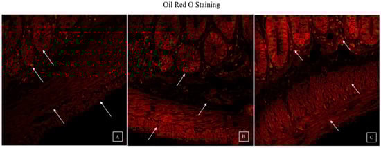 The lipid staining of the colon bilayer with Oil red O dye revealed the development of lipid droplets associated with Lieberkühn crypts and an atypical shape indicated by the disruption of TJs in the ethanol group. As illustrated in Figure 6, the synbiotic intervention reduced lipogenesis and improved the epithelial barrier compared to the control group.