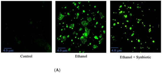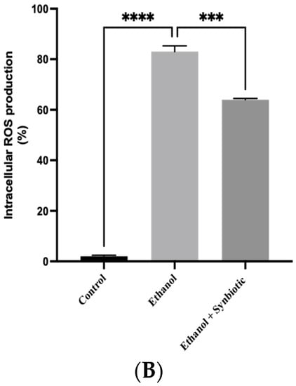 (A) Synbiotic (AGE + Lactobacillus rhamnosus) affects ethanol-induced intestinal dysbiosis when used alone or in combination. (B) Fluorescence staining and spectroscopy at 485/525 nm were conducted following carboxy-H2-DCFDA incubation. The scale of the images is 4.0 μm. The statistical analysis was calculated as mentioned in Section 2.10, *** p < 0.001, **** p < 0.0001.