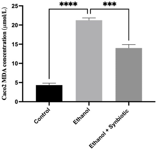 MDA levels in ethanol-treated Caco-2 monolayer cells were 20.03 ± 0.04 uM/L compared to 3.5 ± 0.05 μM/L in the control group. Figure 8 shows that Caco-2 with the synbiotic and ethanol had lower MDA levels of 14.6 ± 0.05 μM/L than the ethanol groups.