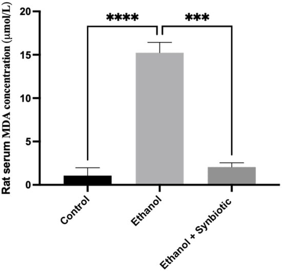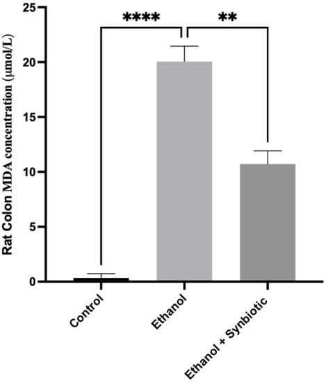 Compared to the control group (0.07 ± 01 μM/L), ethanol-treated rats had a serum MDA content of 15.03 ± 0.07 uM/L. However, as shown in Figure 9, the prophylactic therapy of synbiotics with ethanol significantly lowered MDA levels to 2.20 ± 0:02 uM/L.