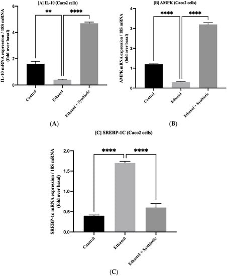 The mRNA expression of (A) IL-10, (B) AMPK, and (C) SREBP-1c in Caco2 cells is illustrated here. The anti-inflammatory markers IL-10 and AMPK were considerably increased after synbiotic (AGE + L. rhamnosus) treatment, whereas the inflammatory marker SREBP-1c was decreased. The statistical analysis was calculated as mentioned in Section 2.10. Mean −/+ SD was determined for N = 6 replicates. For statistical analysis, GraphPad Prism 7 and one-way ANOVA in conjunction with the Tukey post hoc test were calculated. When associated with the ethanol group, significance (p-value) is defined as ** p < 0.01, **** p < 0.0001.