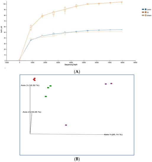 The rats were fed Lieber–DeCarli for two days to acclimatize them. After acclimatization, rats had unrestricted access to 1% ethanol-Lieber–DeCarli food. The ethanol-stimulated intestinal barrier damage trial lasted 25 days with increasing ethanol concentrations (v/v) as described in Mutlu, E. et al., 2009 [26]. The synbiotic was administered orally at 109 CFU/ day Lactobacillus rhamnosus MTCC 1423 and 200 mg/kg of AGE to the respective rat’s group. At the end of the feeding trial, i.e., 5 weeks, fecal samples were collected from the rats of each group under 12 h fasting condition. Later, fasting rats were anesthetized with Pentobarbital (Nembutal®) 40–60 mg/kg, followed by blood withdrawal from the vena cava. Colon specimens were later collected, fixed in RNA, and processed per the protocol described in Kema et al., 2017 [28]. Serum and fecal samples were stored at −80 °C until further use.