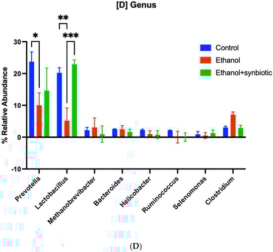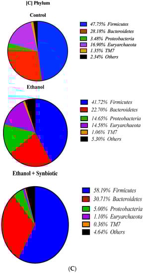 A Wistar male rat fecal sample (N = 3) was examined by the QIIME 2 tool for 16S rRNA analysis. As a result, after implementing the Lieber–DeCarli diet, the alpha diversity between the control, ethanol, probiotic, and synbiotic groups was examined to evaluate the gut microbiota associated with the acute alcohol model. After treatment, the ethanol group’s alpha diversity indices were negatively correlated and considerably lower than those of the control group (Figure 13A). Additionally, the ethanol-and-synbiotic treatment group had nearly identical diversity to the control group. However, although the changes were not substantial, the ethanol-and-synbiotic-treated group exhibited higher species richness and diversity indicators. The beta diversity analysis identified the ethanol-treated group from the standard control group (Figure 13B). Compared to the ethanol-and-synbiotic-treated, ethanol, and control groups, the fecal microbiota structure and composition differed considerably. Firmicutes were the most predominant phylum, accounting for 47.66%, 46.72%, and 58.19% of the gut microbiota in the control, ethanol, and ethanol-and-synbiotic groups, respectively. These were followed by Bacteroidetes (28.12%, 25.42%, and 30.70%, respectively) and Proteobacteria (3.47%, 16.40%, and 5.00%, respectively) (Figure 13C). However, in the ethanol-and-synbiotic and ethanol groups, the overgrowth of Proteobacteria and Firmicutes was not statistically significant. Additionally, abundances at the genus level in each group were significantly different. Prevotella, Lactobacillus, [Prevotella], Methanobrevibacter, Bacteroides, Helicobacter, Ruminococcin, Selenodonts, and Clostridium increased in control, and ethanol-and-synbiotic groups, whereas Prevotella is most prevalent in the ethanol group. At the same time, the group that consumed ethanol-and-synbiotic had significantly more Lactobacillus (Figure 13D). These results suggest that ALD created an excess of proinflammatory pathobionts in a dysfunctional intestinal composition, which may have accelerated ALD.