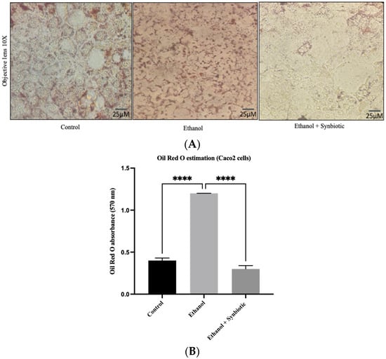 (A) Oil Red O-stained Caco-2 cells. Compared to the control group, the accumulation of lipids in Caco-2 cells increased in the ethanol group but was reduced significantly by synbiotic treatment at 100X. (B) Graphical representation of the Oil red O absorbance. The statistical analysis was calculated as mentioned in Section 2.10, **** p < 0.0001.