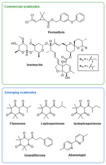 Structures of two commercial scabicides, ivermectin and permethrin, and five emerging scabicides, including a commercial head lice drug, abametapir, and four β-triketones commonly found in mānuka oil, flavesone, leptospermone, isoleptospermone, and grandiflorone.