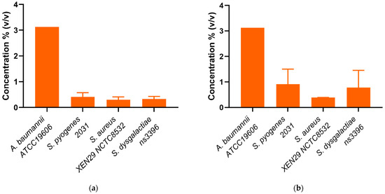(a) Minimum inhibitory concentrations (MIC) and (b) Minimum bactericidal concentrations (MBC) of mānuka oil (% v/v) against four scabies-associated bacteria.